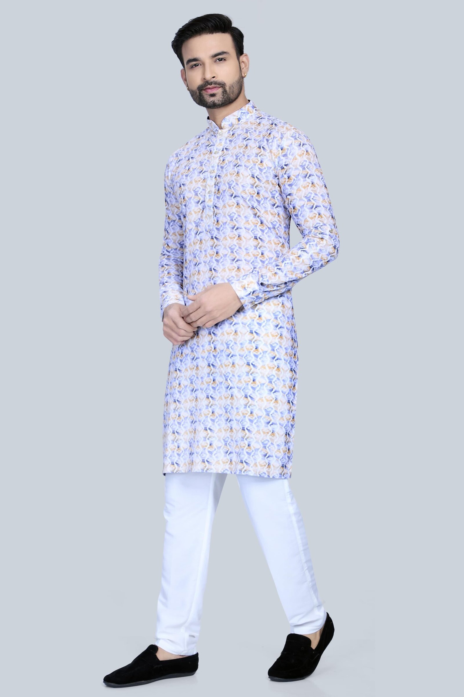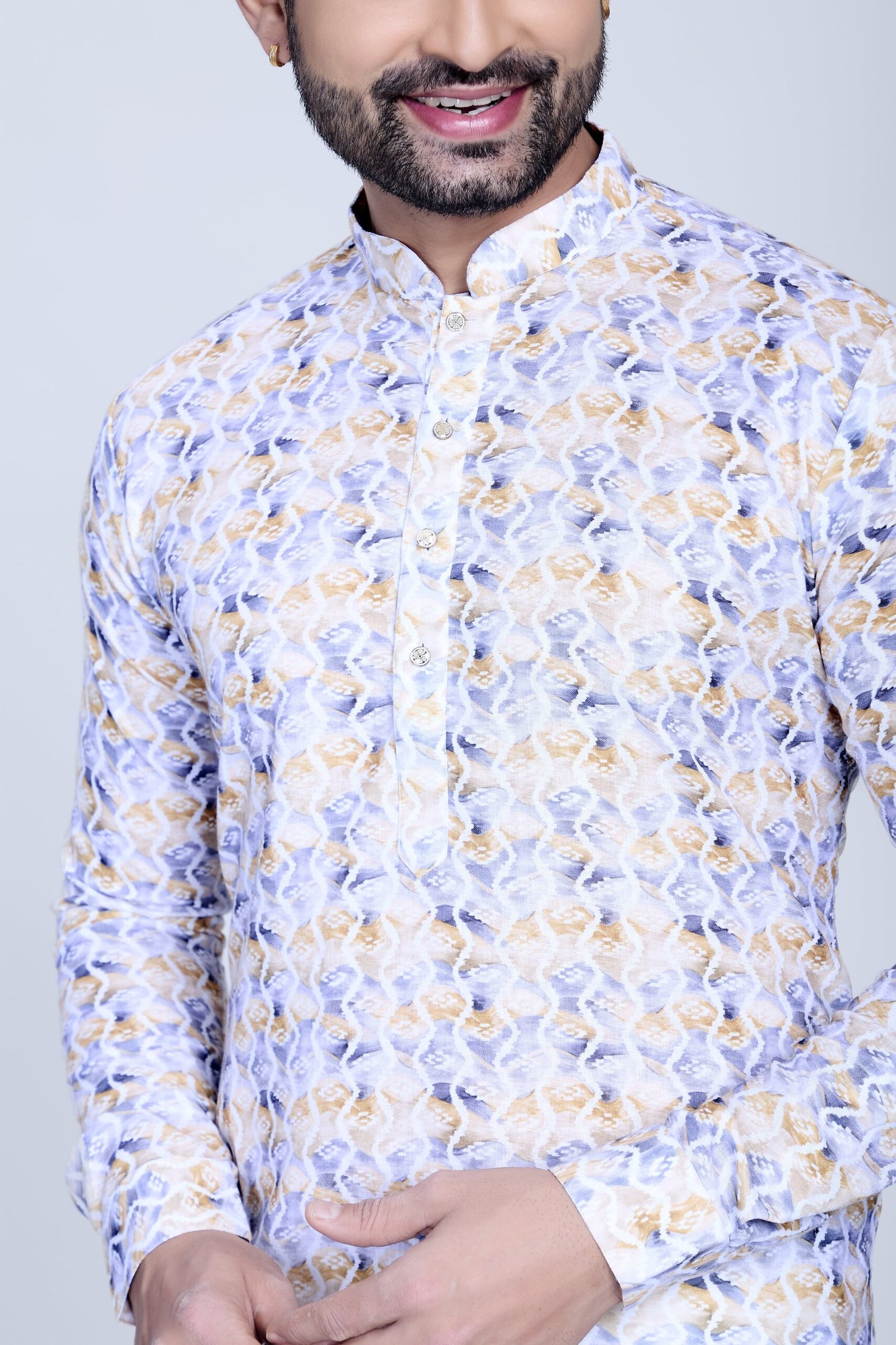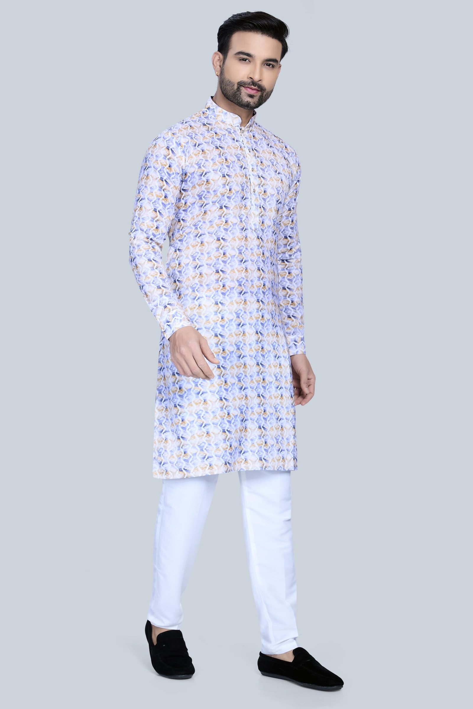Showcase your style and cultural pride in this versatile Indian outfit. The airy kurta keeps you cool while the classic print and color pay homage to tradition. Pair it with the crisp white trousers for a put-together look suitable for any occasion, from festivals to formal events.