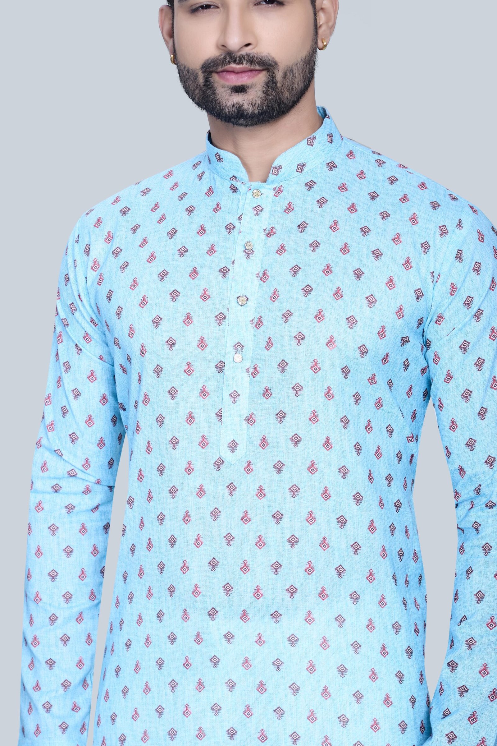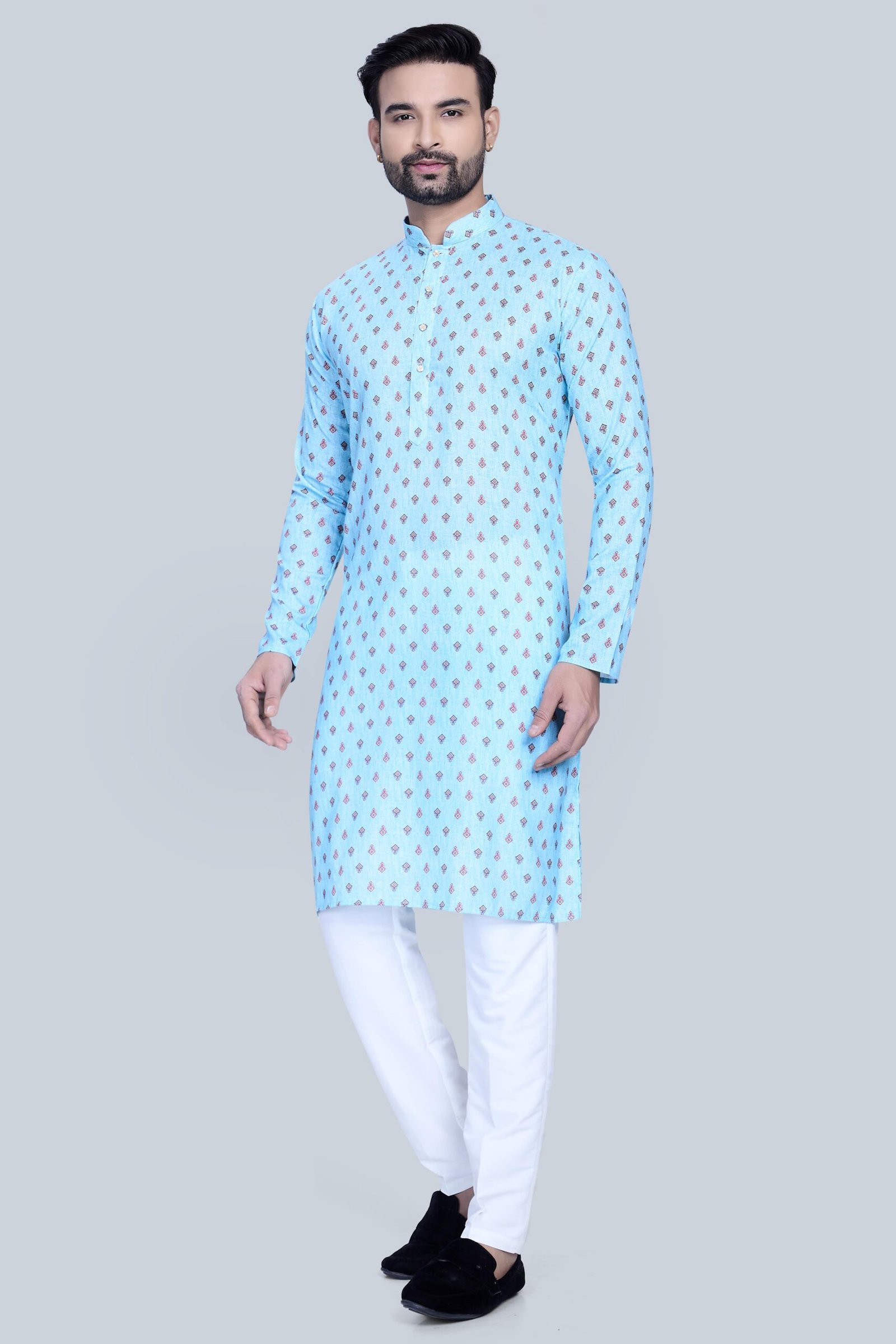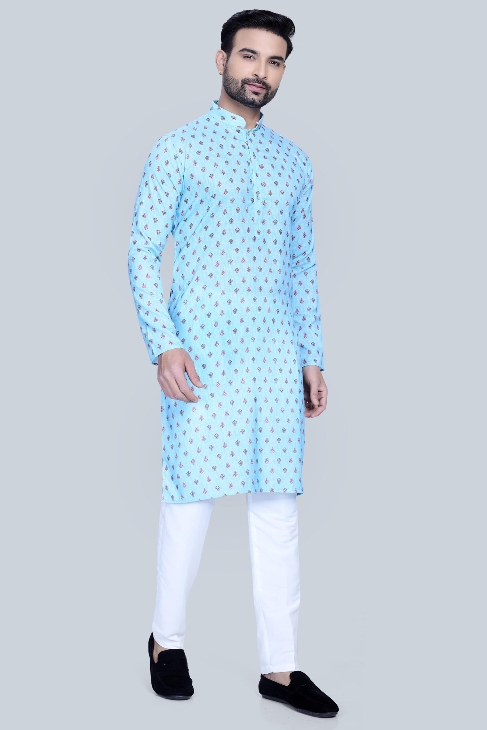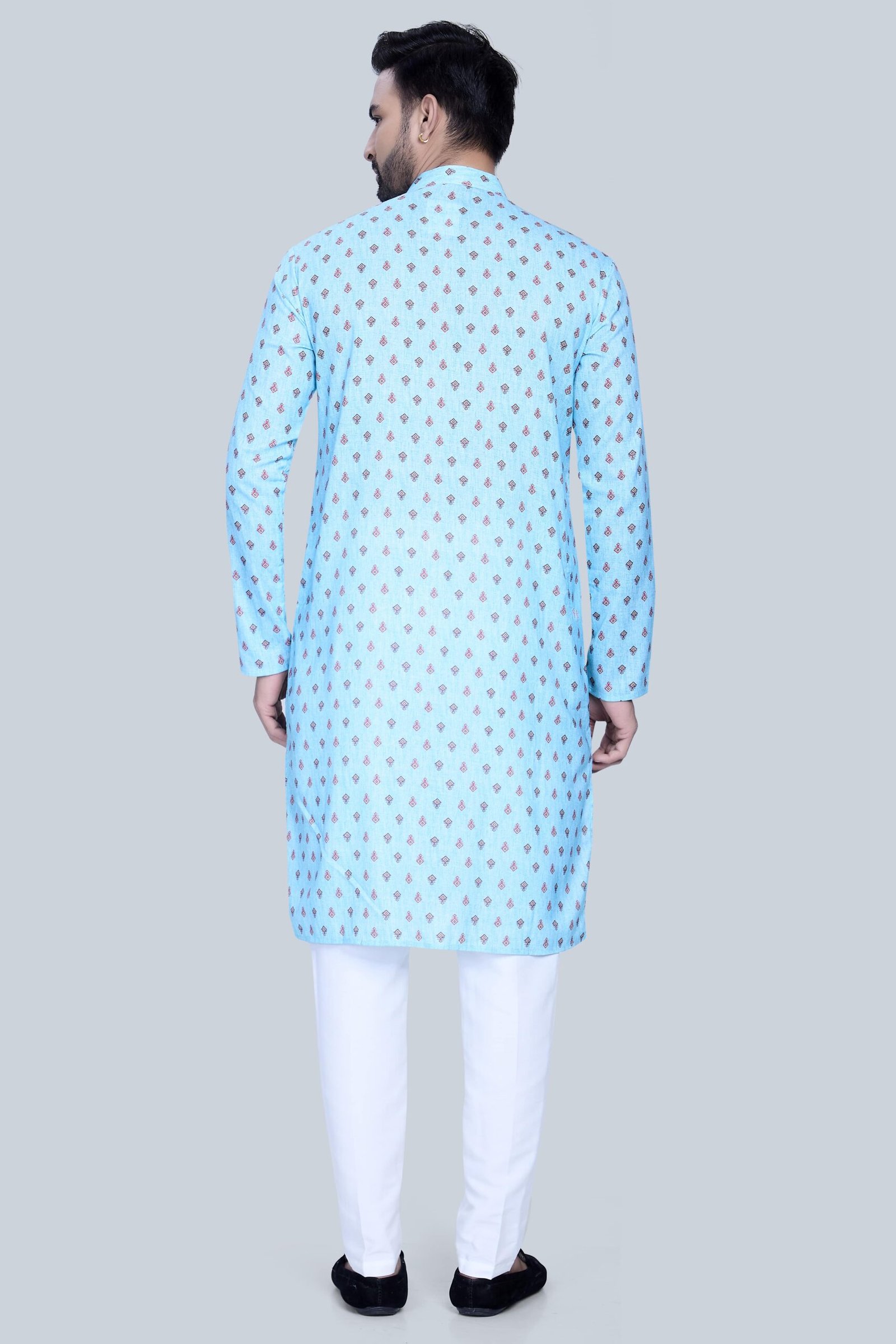 Stand out from the crowd in this traditional yet stylish Indian ensemble. This Sky blue printed kurta paired with white trousers is the perfect blend of comfort and elegance.