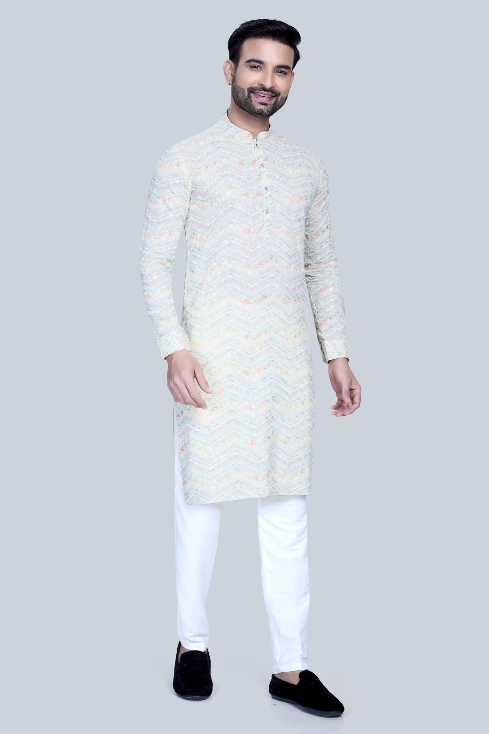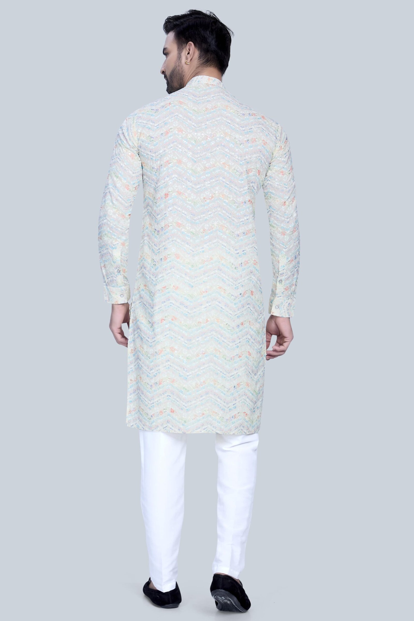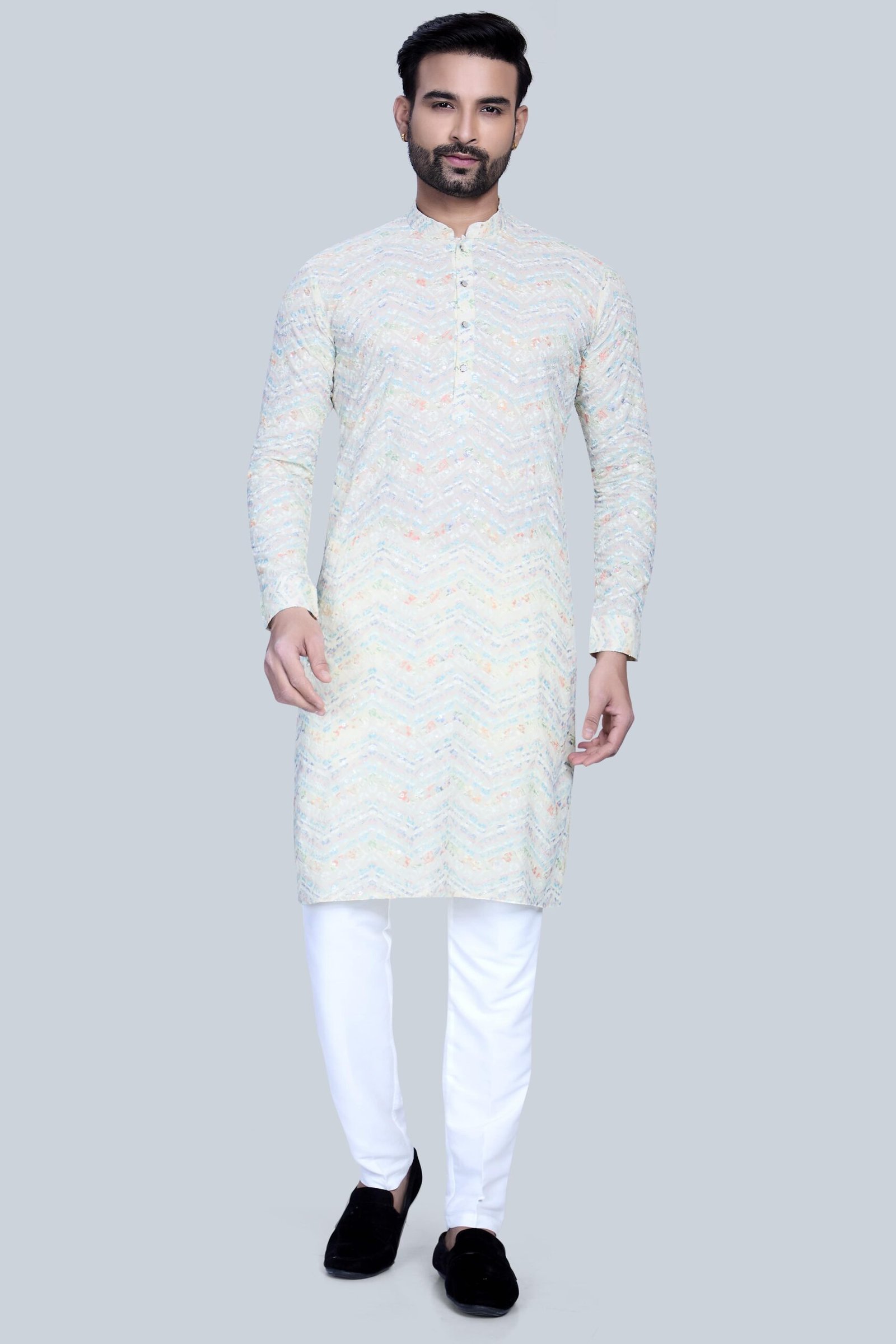 Step out in style with this exquisite men’s chikankari kurta set. Featuring a classy straight-fit kurta in a subtle Multi Color print and crisp off white trousers, this outfit will have you looking and feeling your best.