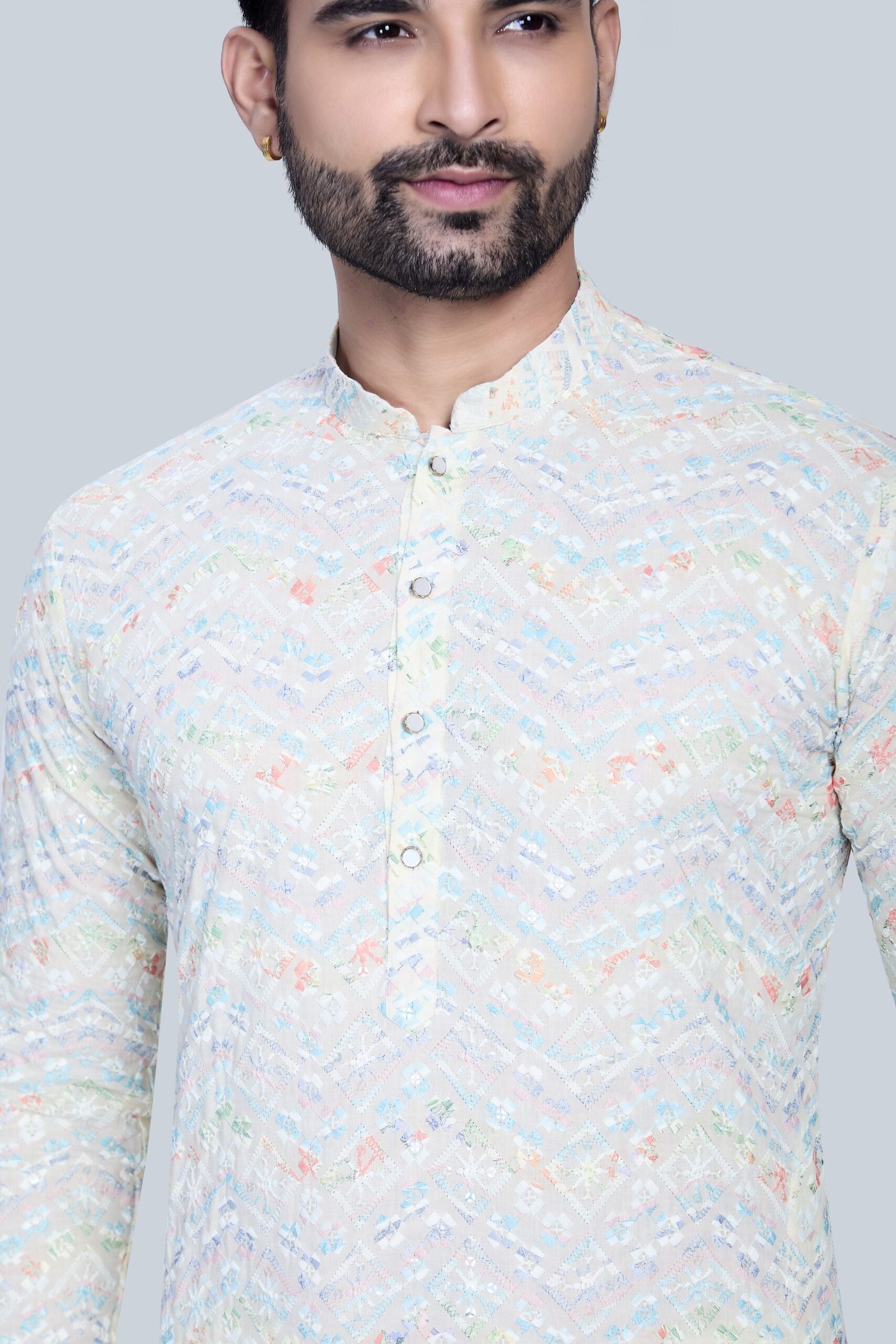 Exquisite men’s chikankari kurta set featuring a classy straight-fit kurta in a multi colored print, this outfit will have you looking and feeling your best.