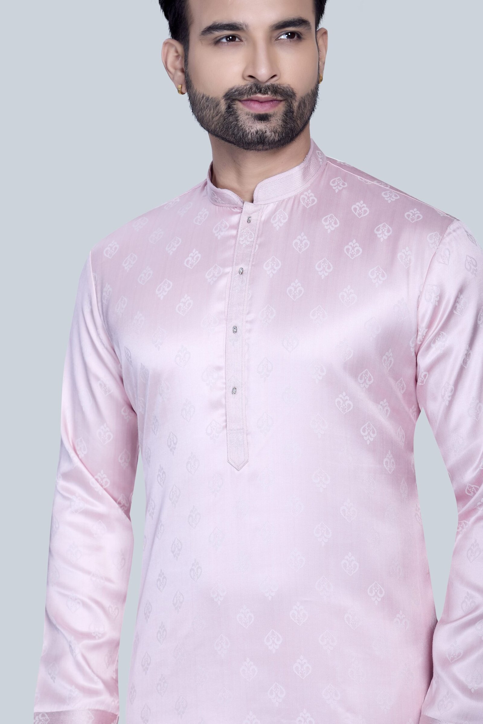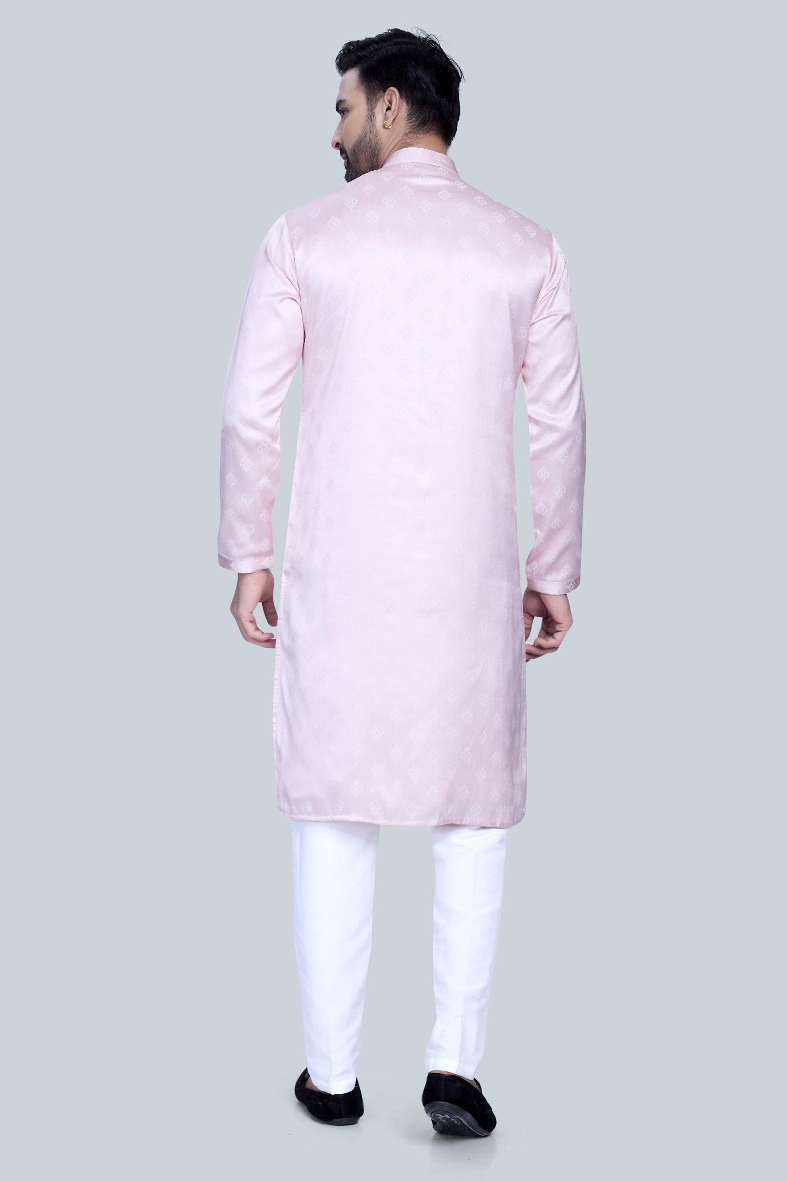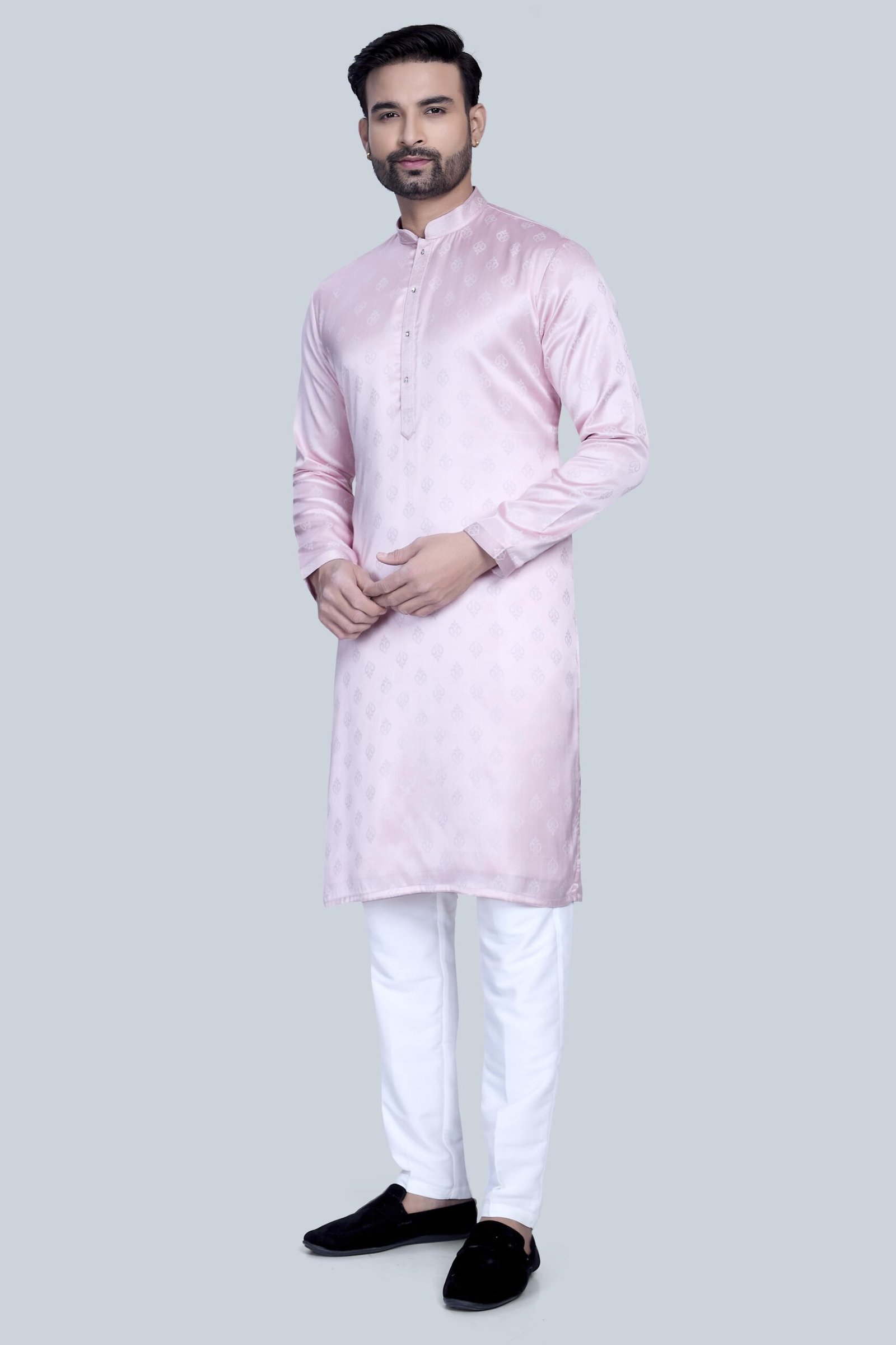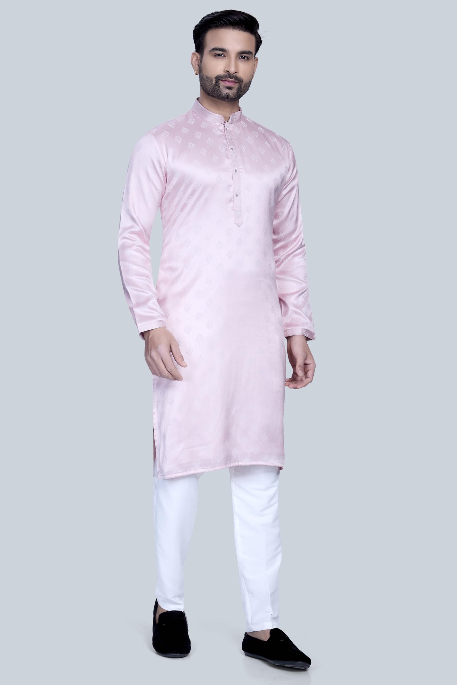 A traditional kurta with a modern twist! This Men’s Straight cut Jacquard kurta is crafted with Viscose Jacquard fabric featuring subtle, eye-catching thread work for a stylish yet comfortable look. Paired with off white trousers for a complete ensemble.