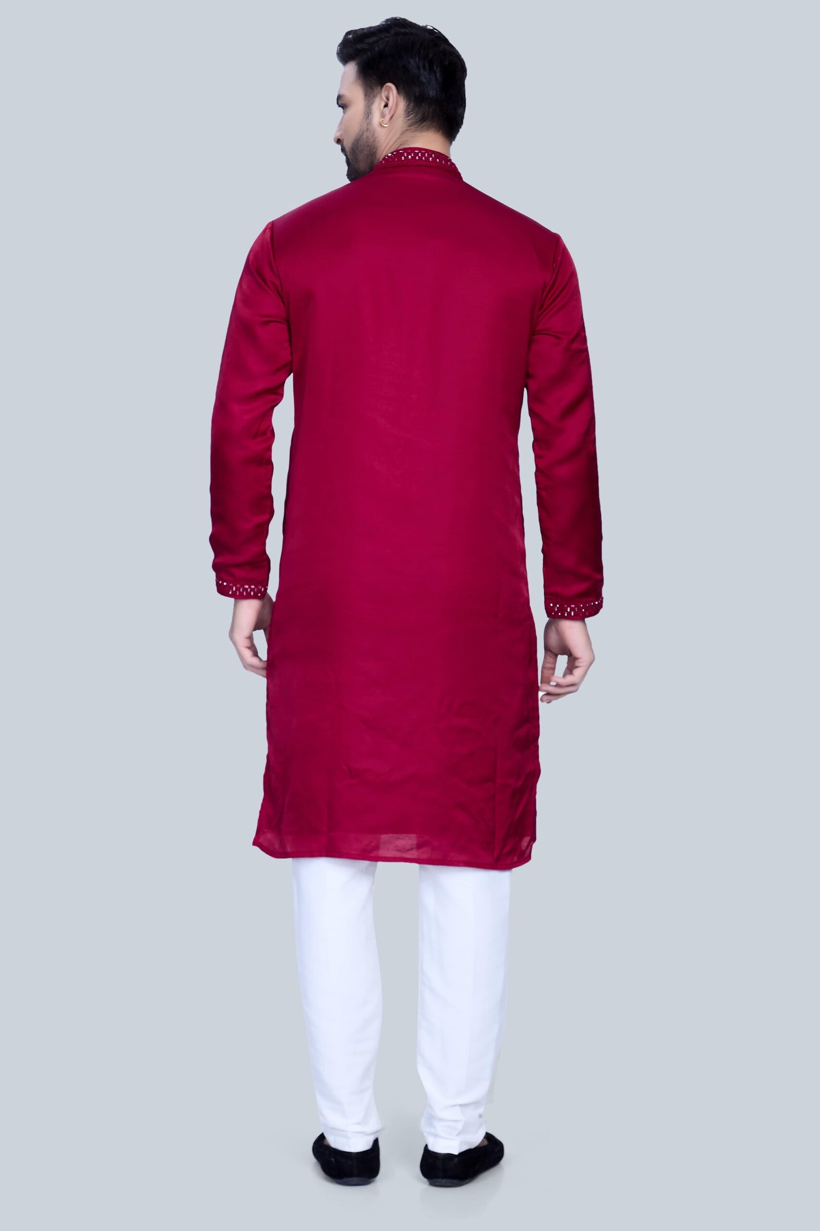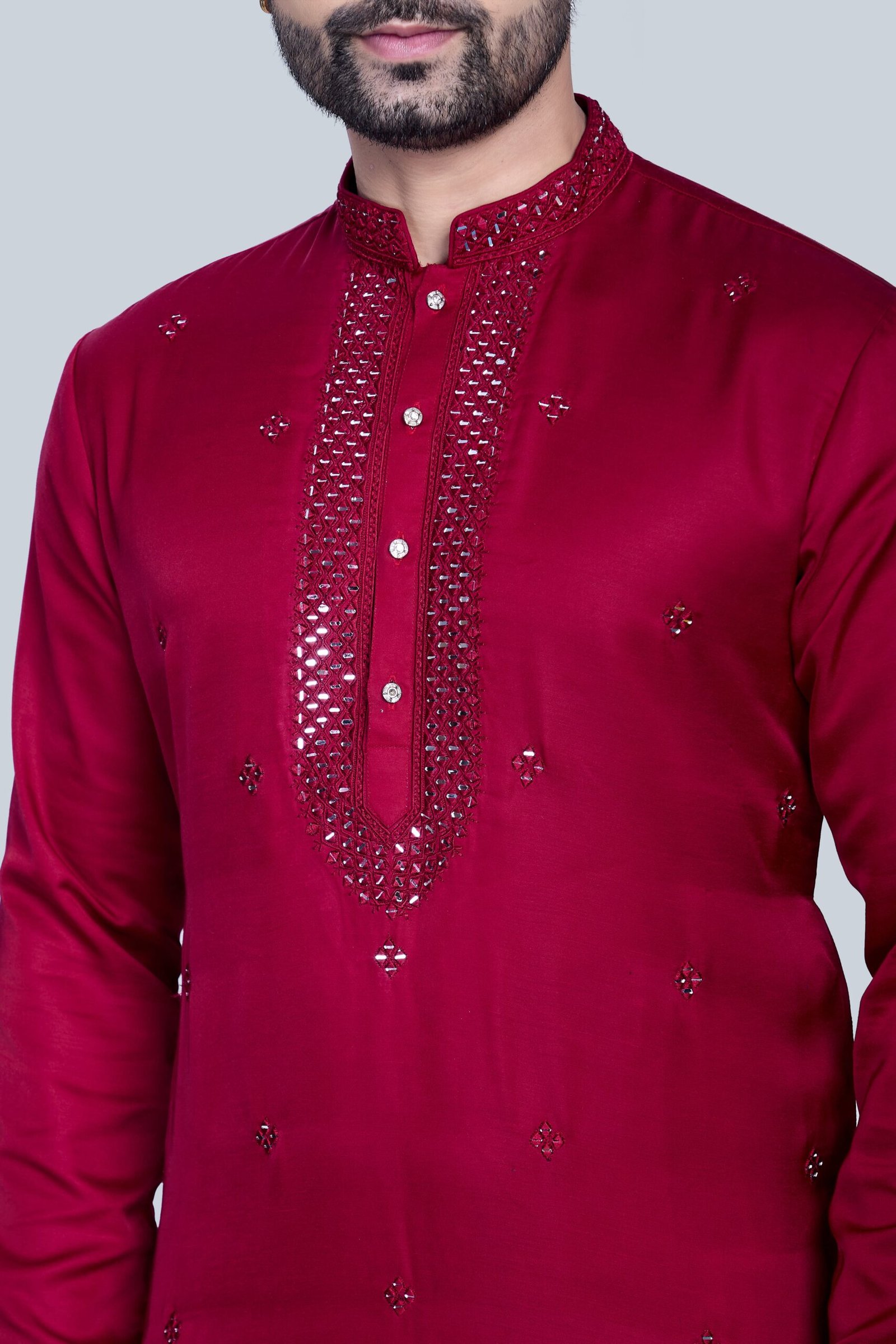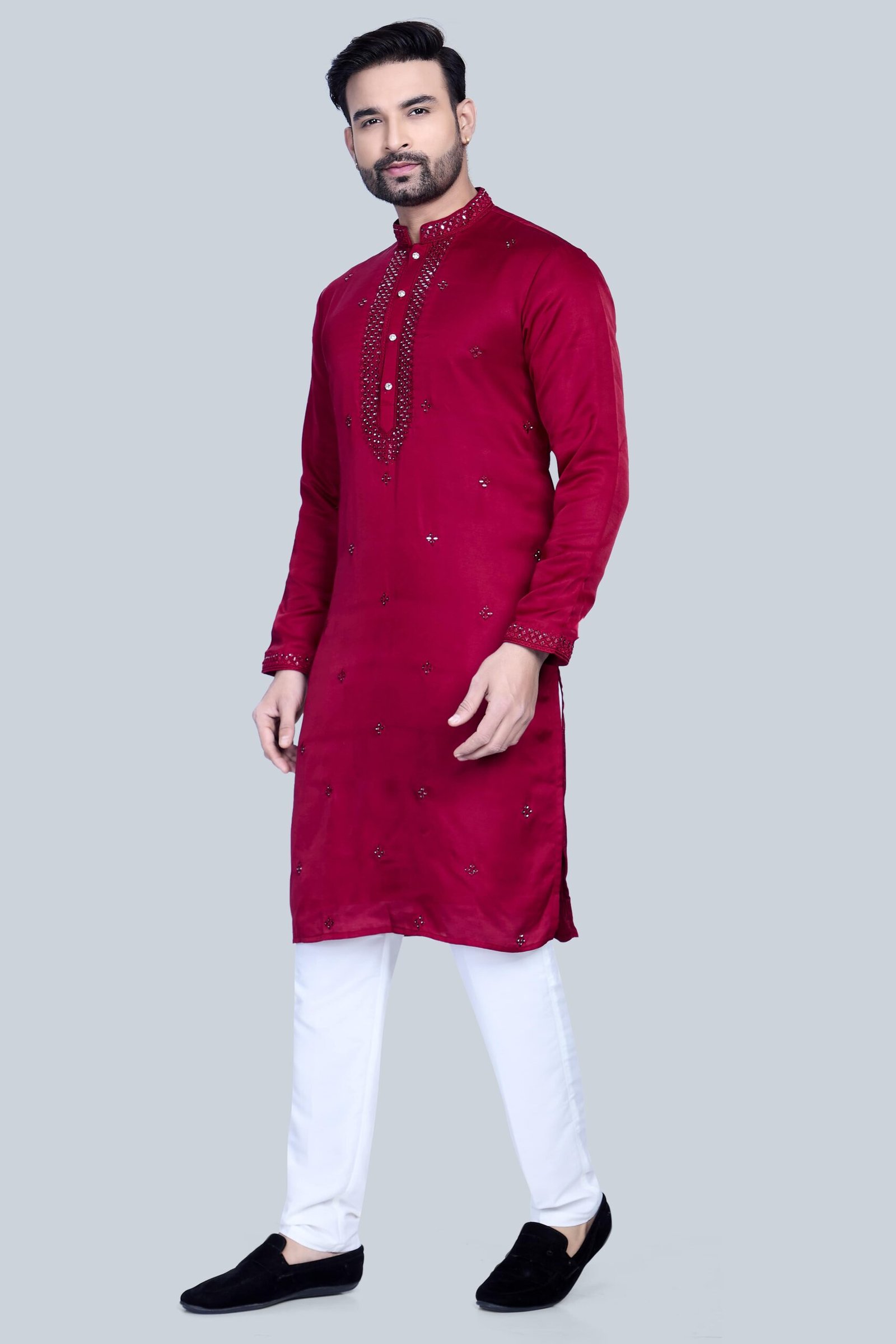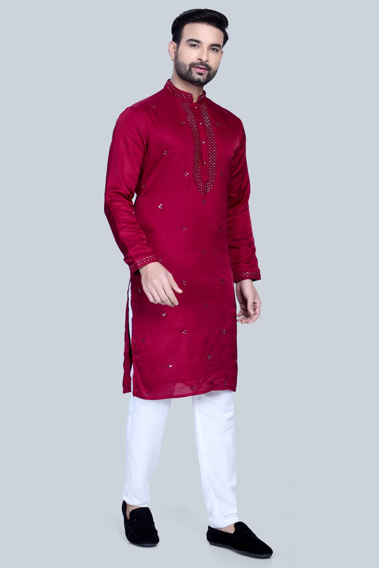 Bring a touch of royal elegance to your wardrobe with this eye-catching Men’s Elegant Satin Kurta. This vibrant red satin fabric glimmers with intricate mirror work for a refined, sophisticated look.