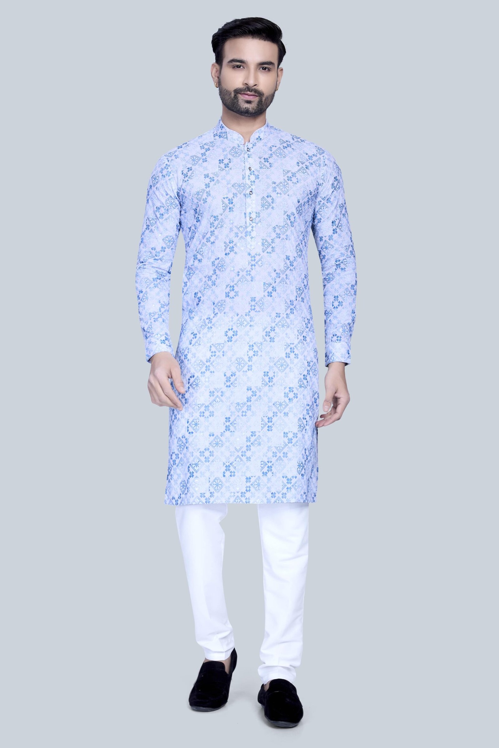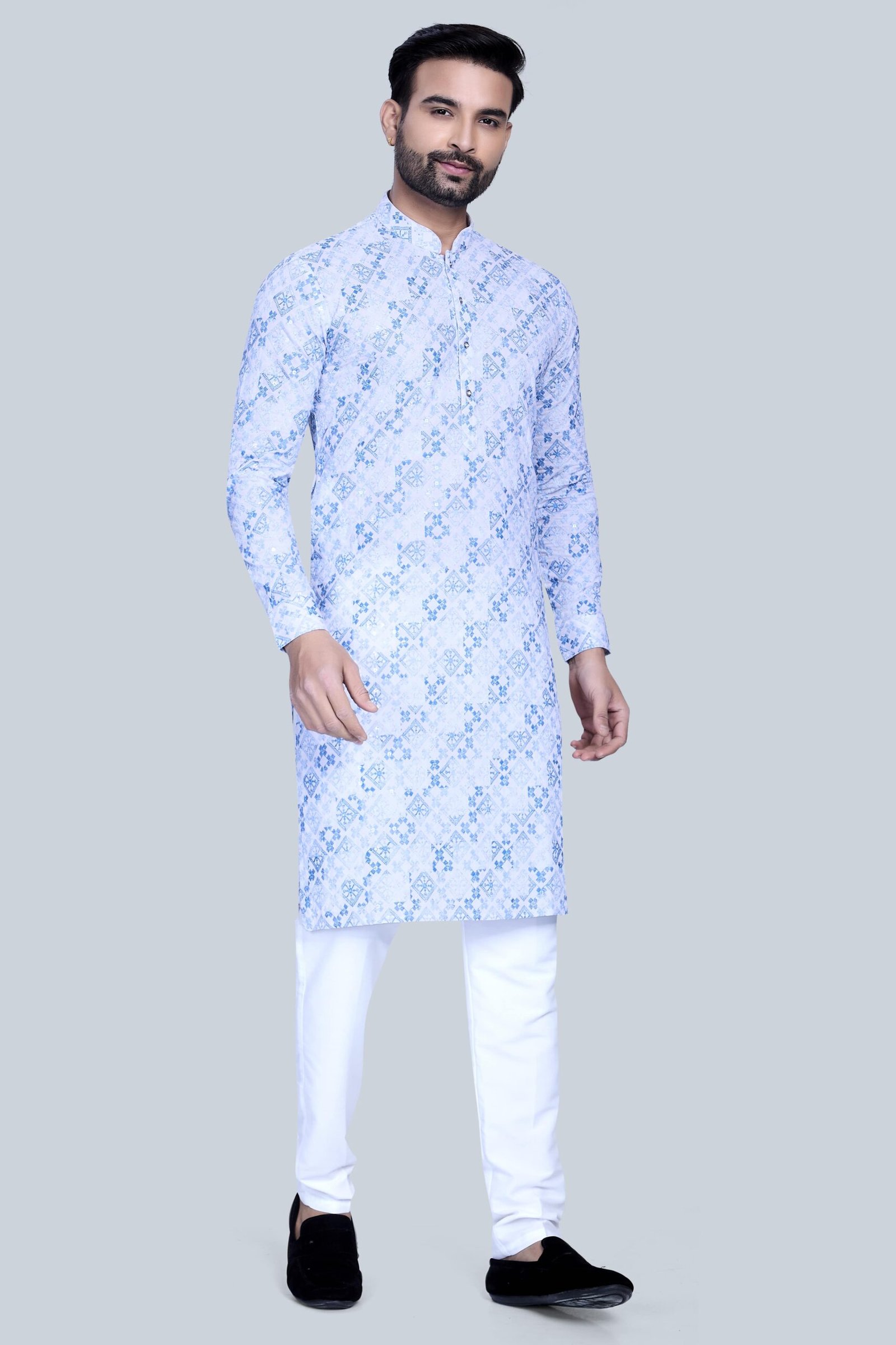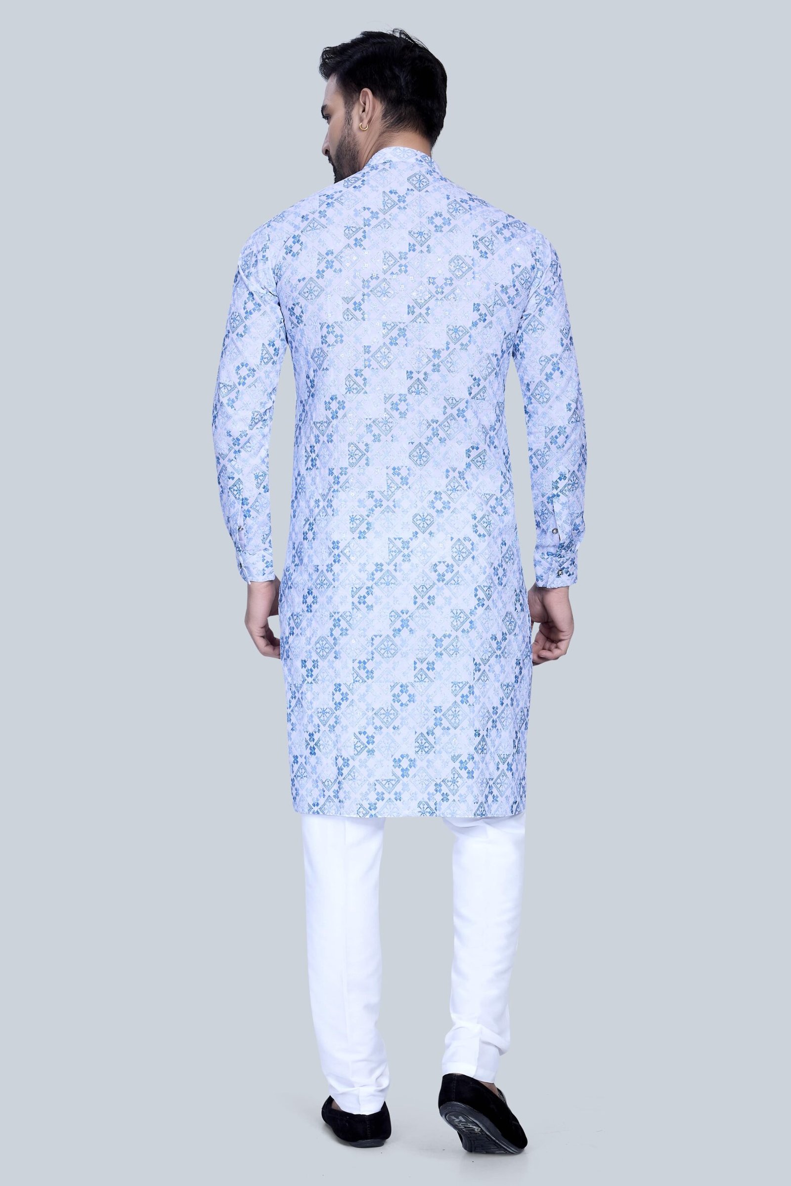 Exquisite men’s chikankari kurta set featuring a classy straight-fit kurta in a subtle sky blue print, this outfit will have you looking and feeling your best.