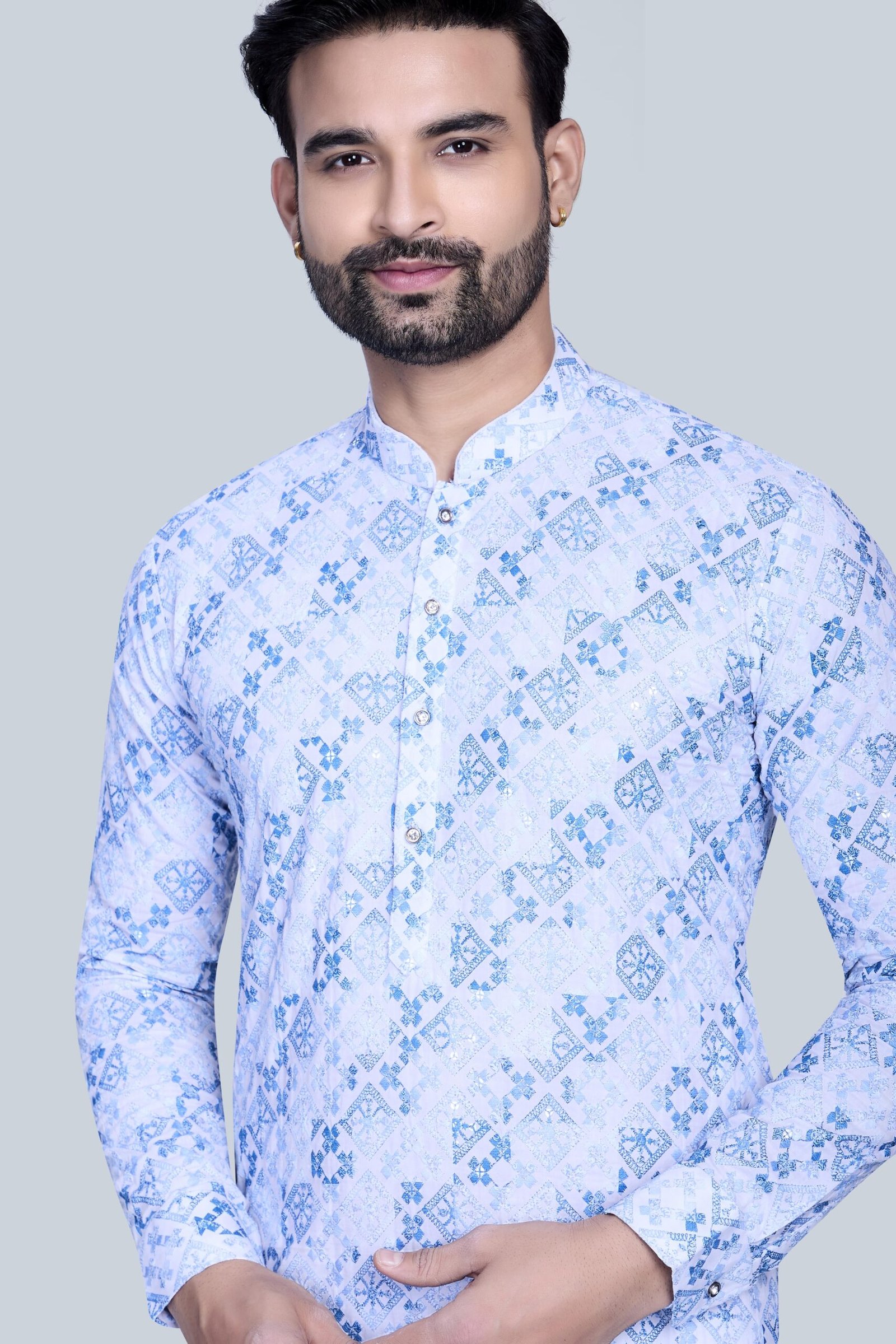 Step out in style with this exquisite men’s chikankari kurta set. Featuring a classy straight-fit kurta in a subtle sky blue print and crisp white trousers, this outfit will have you looking and feeling your best.